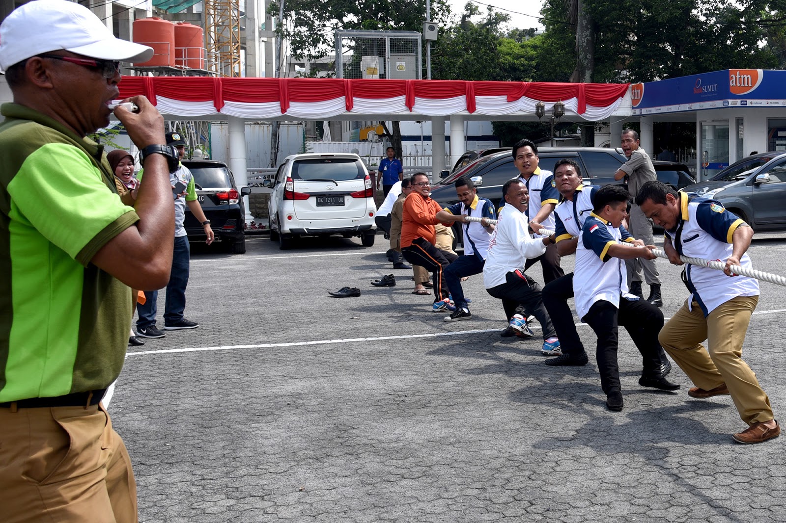 Tarik tambang juga menjadi tontonan yang menarik, di tengah teriknya cuaca di Kota Medan peserta begitu semangat beradu kekuatan dengan lawan-lawannya, begitu juga penonton yang menyemangati rekan-rekannya.