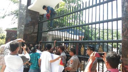 Karena tidak ada tanda-tanda seorang pun yang menanggapi aspirasi mereka, salah seorang orator nekat memanjat pagar walaupun sudah dilarang petugas Keamanan Bagian Dalam (Kamdal) Kejati maupun aparat kepolisian yang sedang berjaga-jaga di depan gerbang.