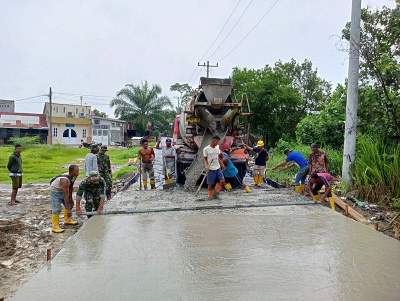 Meski cuaca ekstrem kadang hujan dan panas personel Satgas terus melanjutkan pekerjaan fisik pengecoran jalan sepanjang 335 meter x 5 meter dan pengecoran jalan/rigid beton di Jalan Pasar Nippon sepanjang 600 meter x 4 meter di Kelurahan Paya Pasir. (ENC-1)