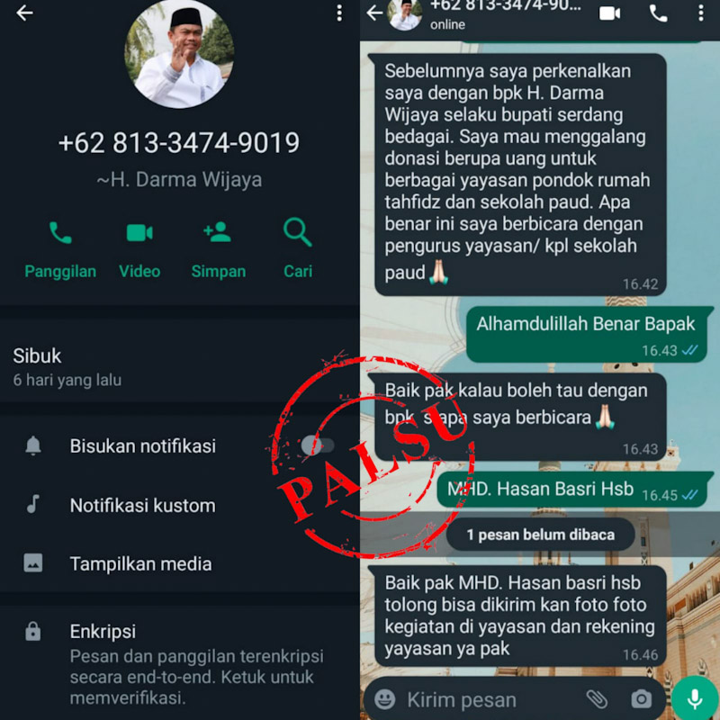 Setelah sebelumnya akun Facebook Bupati Sergai diduplikasi untuk perbuatan kriminal, kali ini kejahatan serupa dilakukan oleh oknum tak bertanggungjawab pada akun WhatsApp-nya.