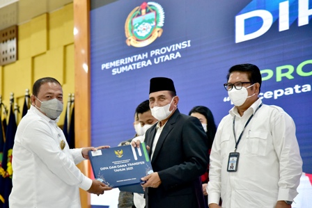 EKSISNEWS.COM, Medan – Gubernur Sumatera Utara (Gubsu) Edy Rahmayadi menyerahkan dokumen Daftar Isian Pelaksanaan Anggaran (DIPA) dan Transfer Ke Daerah dan Dana Desa (TKDD) Tahun 2021 kepada satuan kerja (Satker) dan pemerintah kabupaten/kota se Sumut, di Pendopo Rumah Dinas Gubernur Sumut, Jalan Jenderal Sudirman Nomor 41 Medan, Jumat (27/11/2020). Diharapkan anggaran tersebut dapat segera digunakan untuk percepatan pembangunan.