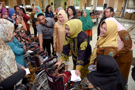 Bantuan diserahkan Ketua Tim Penggerak PKK Provinsi Sumut Nawal Edy Rahmayadi yang didampingi Wakil Ketua TP PKK Sumut Sri Ayu Mihari Musa Rajekshah dan Kepala Dinas Pemberdayaan Perempuan dan Perlindungan Anak (PPPA) Sumut Nurlela kepada puluhan penyandang disabilitas, di Aula Raja Inal Siregar, Kantor Gubernur Sumut, Jalan Pangeran Diponegoro Nomor 30, Medan, Selasa (13/8/2019).