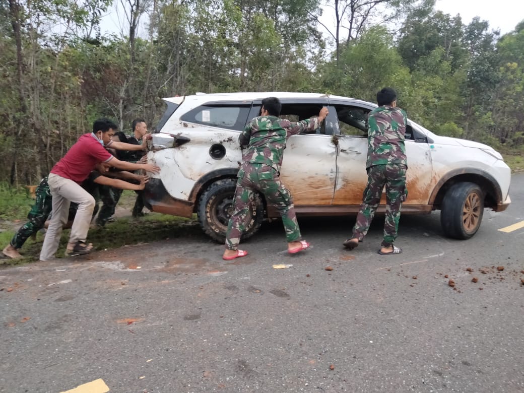 EKSISNEWS.COM, Marauke – Personel TNI Satgas Pamtas RI-PNG Yonif 123/RW Pos Sambleber membantu mengevakuasi satu unit mobil korban kecelakaan tunggal yang terguling di Jalan Trans Papua Lintas Merauke-Boven Diegol KM. 94 Distrik Sota Kab. Merauke.