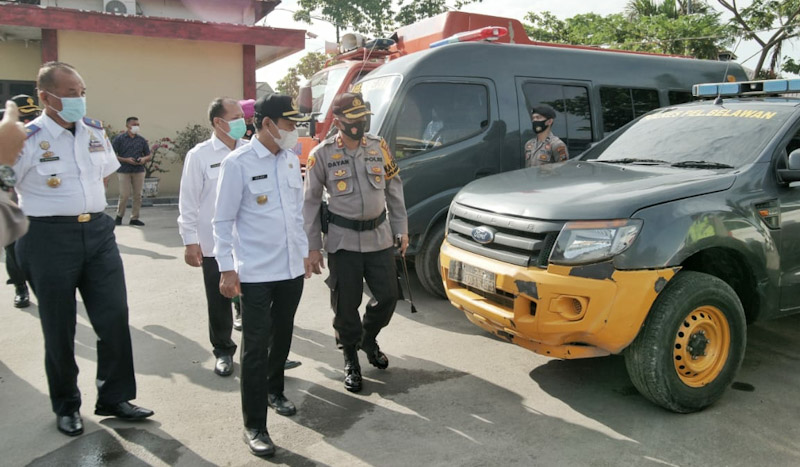 Usai memimpin apel, Pjs Wali Kota bersama Kapolres Pelabuhan Belawan, unsur Forkopimda dan sejumlah PJU Polres Pelabuhan Belawan berkeliling melihat dan memastikan kesiapan seluruh personil serta kelengkapan alat juga armada yang digunakan dalam penanganan bencana.(ENC-1)
