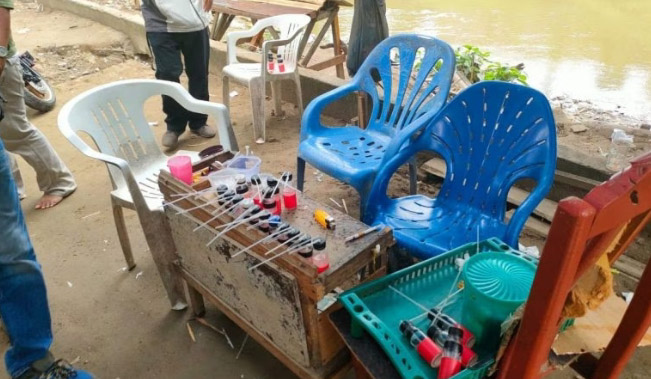 Keempat pria tersebut berinisial B (43), MAS (46), W (23) dan AP (32). Dari keempatnya, polisi mengamankan barang bukti 28 buah alat hisap sabu (bong), 2 paket plastik kecil berisi sabu, 12 buah mancis, satu uni Hp dan uang Rp. 190 ribu.