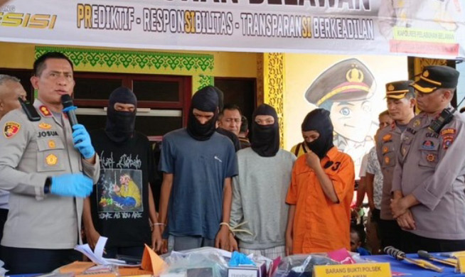 EKSISNEWS.COM, Medan – Polres Pelabuhan Belawan berhasil menangkap empat kormplotan begal yang beraksi di Belawan. Komplotan begal itu menggunakan seorang wanita sebagai umpan dengan modus berkenalan di sosial media dan mengajak bertemu.