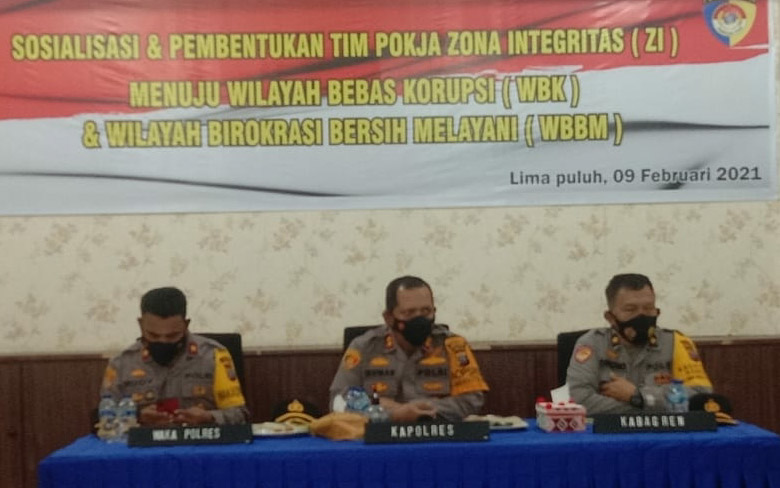 Kapolres Batubara AKBP Ikhwan Lubis SH.MH membuka resmi pembentukan team Pokja zona integrasi Wilayah Bebas Korupsi (WBK) dan Wilayah Birokrasi Bersi Melayani (WBBM) di Aula Bayangkari Mapolres Batubara Selasa (9/2/2021).