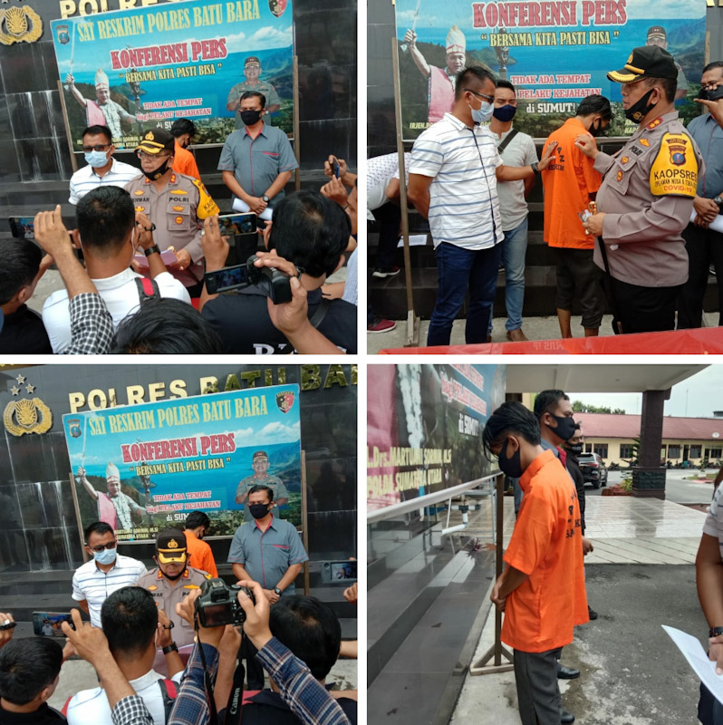 EKSISNEWS.COM, Batubara – Polres Batubara Kamis (22/10/2020) siang, menggelar temu pers tentang penangkapan Arwan Syaputra, seorang mahasiswa yang menjadi kordinator dan juga orator lapangan aksi demo menolak UU omnibus law di depan gedung DPRD Kabupaten Batubara pada Senin (12/10/2020) yang menyebabkan kerusakan kantor DPRD, juga terlukanya seorang perwira polisi Polres Batubara.