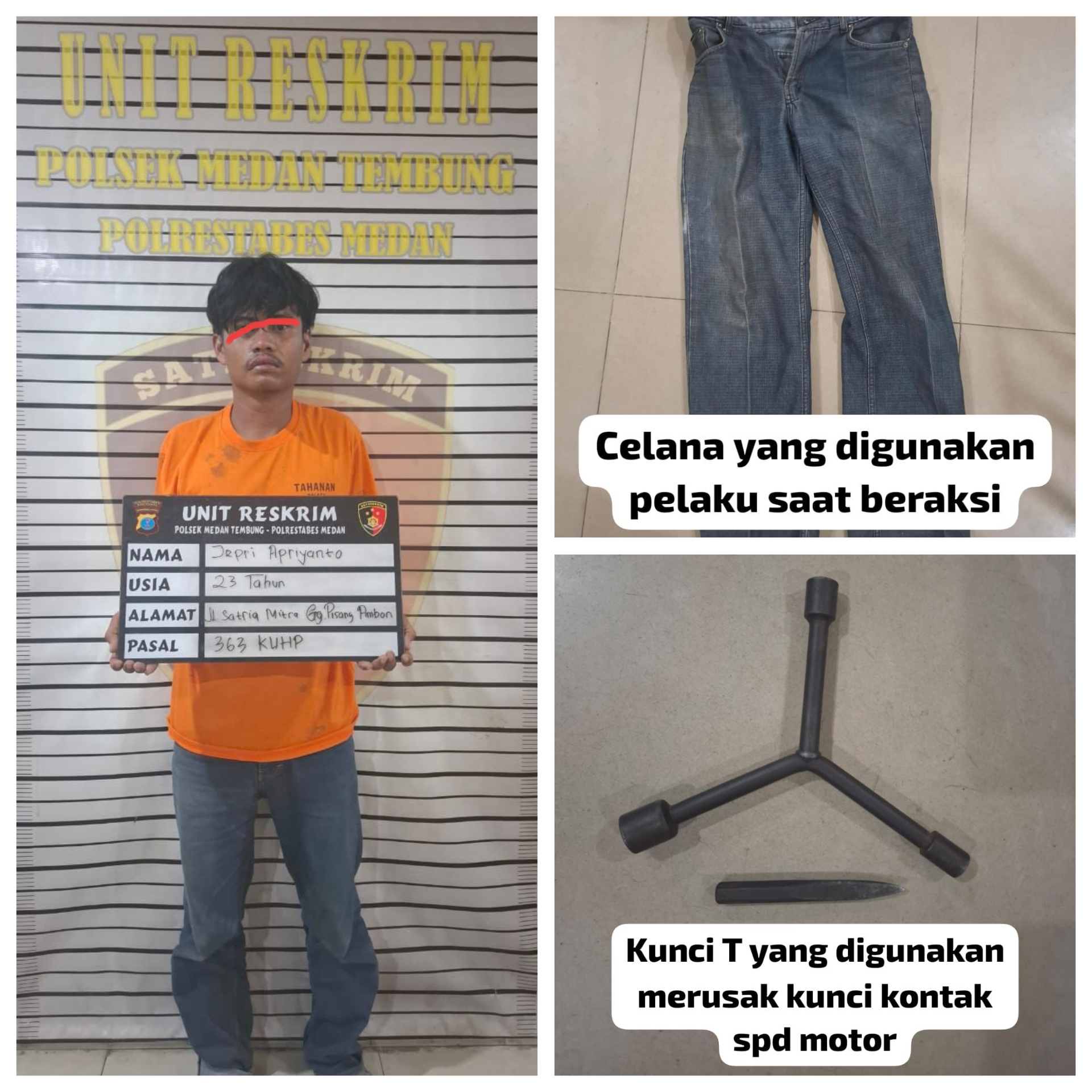 Dalam pengungkapan ini yang dipimpin Kanit Reskrim Iptu Parulian Sitanggang dan Panit Opsnal Ipda Hendrawan Bakti, petugas berhasil meringkus pelakunya yakni berinisial JA alias Ompong (23) warga Jalan Satria Mitra Gang Pisang Ambon, Desa Medan Estate, Kecamatan Percut Sei Tuan, Kamis (12/6/2025).