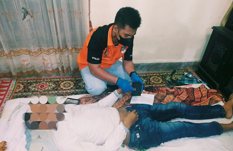Informasi yang dihimpun dari kepolisian, korban meninggal dunia dengan cara gantung diri di dapur menggunakan seutas tali dengan mengenakan baju warna putih dan celana jeans serta dari mulut korban terlihat mengeluarkan air liur.