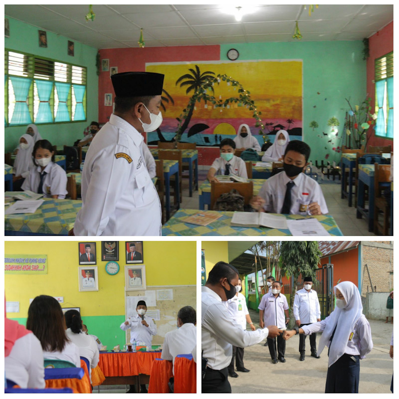 Dalam tinjauan kali ini, Bupati Darma Wijaya memantau simulasi prokes yang dilaksanan, mulai dari saat masuk ke sekolah, para murid memakai masker, mencuci tangan dengan sabun dan dilakukan pengecekan suhu tubuh. Ketika berada di dalam kelas, jaga jarak juga dilakukan. Setiap meja diisi oleh hanya satu orang murid.