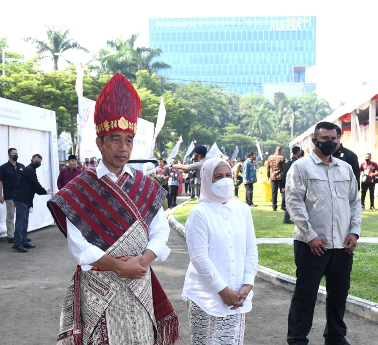 Didampingi Ibu Iriana Joko Widodo, Presiden Jokowi yang tiba sekitar pukul 09.30 WIB tampak menggunakan pakaian adat etnis Sumatera Utara, yaitu Baju Adat Toba.