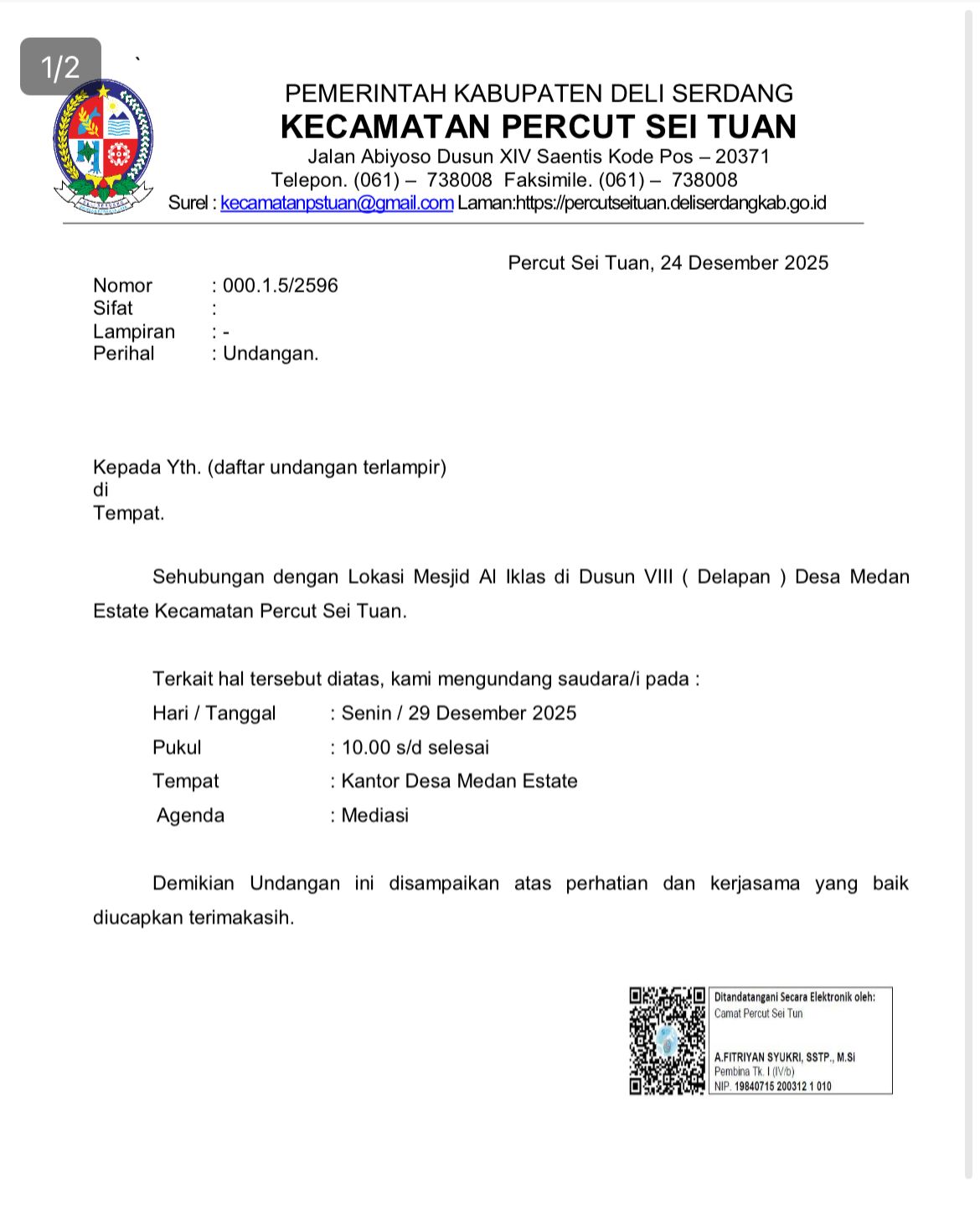 Pertemuan atau rapat terkait relokasi yang masjid itupun telah dilakukan pihak Pemerintahan Kecamatan Percut Sei Tuan bersama beberapa elemen Islam, tokoh masyarakat dilakukan di Kantor Desa Medan Estate pada Senin(29/12/2025) yang dipimpin olah Camat A Fitrian Syukri.