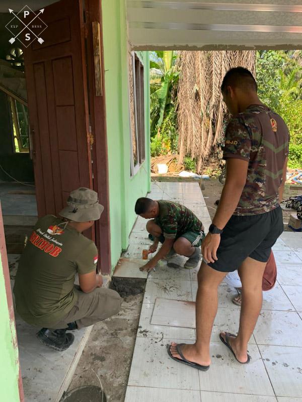 Dalam pekerjaan rehab Gereja GKPI personel Satgas dan warga melanjutkan pemasangan keramik lantai teras dan selasar Gereja GKPI.