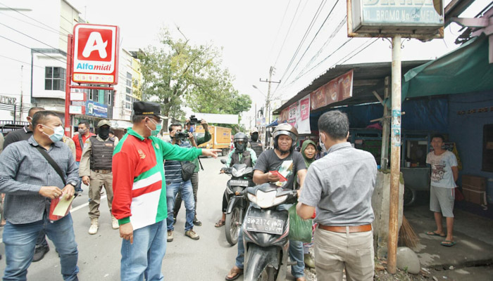 EKSISNEWS.COM, Medan – Pelaksana tugas (Plt) Wali Kota Medan Ir H Akhyar Nasution MSi melakukan langsung sosialisasi dan edukasi kepada masyarakat untuk selalu menggunakan masker ketika berada di luar rumah. Sosialisasi dan edukasi dilakukan Akhyar di Jalan Bromo, persisinya depan Koramil 03/MD, Kelurahan Tegal Sari Mandala III, Kecamatan Medan Denai, Sabtu (2/5). Selain mengajak masyarakat untuk menggunkan masker, Akhyar juga membagikan 3.000 masker kepada warga.