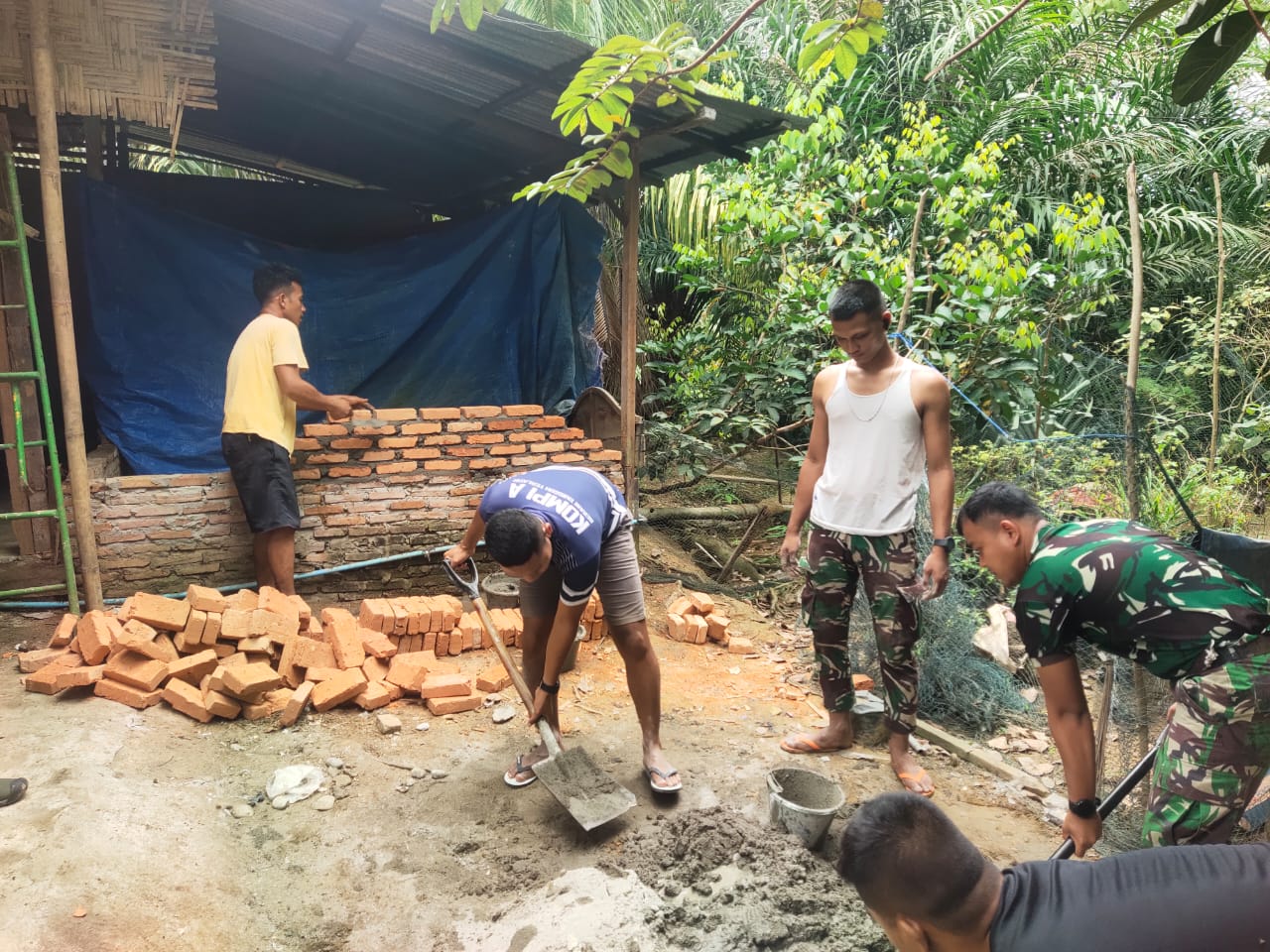 Untuk kegiatan rehab rumah tidak layak huni (RTLH) milik kakek Mara Sutan Batubara personel Satgas dibantu warga melanjutkan pembuatan MCK .