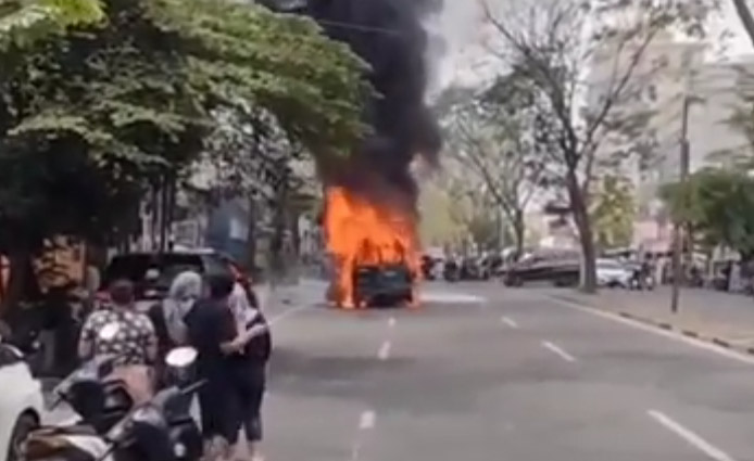 Menurut keterangan dari Lia warga di sekitar lokasi mengatakan, percikan api muncul dari bagian bawah depan mobil.
