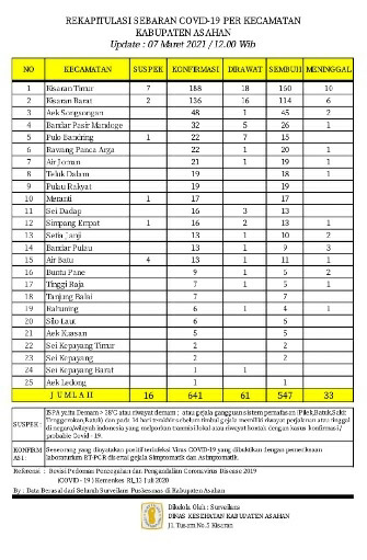 Demikian Data Update tersebut disampaikan Juru Bicara Satuan Tugas Percepatan Penanganan Covid – 19 Kabupaten Asahan H. Rahmat Hidayat Siregar S. Sos. M.Si, Minggu (07/03/2021) berdasarkan hasil data surveilans dari seluruh Puskesmas yang ada di wilayah Kabupaten Asahan sebagaimana di kelola Dinas Kesehatan Kabupaten Asahan pertanggal 07 Maret 2021 hingga pukul 12.00 Wib.