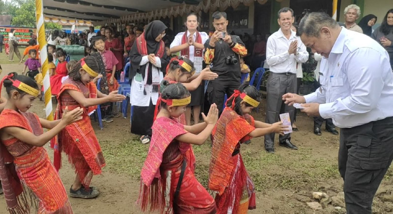 EKSISNEWS.COM, Sidikalang – Sawer dari Bupati Dairi Dr.Edy Kelleng Ate Berutu dan Dandim 0206/Dairi Letkol Inf Goklas P Silaban untuk anak-anak SDN 037994 Juma Borno,Kec Siempat Nempu Hulu yang melakukan tarian penyambutan untuk membeli perlengkapan sekolah.