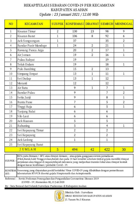 Demikian Data Update tersebut  disampaikan Juru Bicara Satuan Tugas Percepatan Penanganan Covid – 19 Kabupaten Asahan H. Rahmat Hidayat Siregar S. Sos. M.Si, Sabtu (23/01/2021) berdasarkan hasil data surveilans dari seluruh Puskesmas yang ada di wilayah Kabupaten Asahan sebagaimana di kelola Dinas Kesehatan Kabupaten Asahan pertanggal 23 Januari 2021 hingga pukul 12.00 Wib.