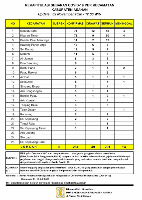 Demikian Data Update tersebut  disampaikan Juru Bicara Gugus Tugas Percepatan Penanganan Covid – 19 Kabupaten Asahan H. Rahmat Hidayat Siregar S. Sos. M.Si, berdasarkan hasil data surveilans dari seluruh Puskesmas yang ada di wilayah Kabupaten Asahan sebagaimana di kelola Dinas Kesehatan Kabupaten Asahan pertanggal 2 Nopember 2020 hingga pukul 12.00 Wib, Senin (02/11/2020) melalui WhatsApp.
