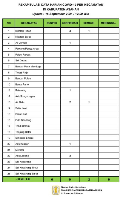 “Untuk Data hari ini akibat Covid – 19 warga Asahan yang Konfirmas sebanyak 9 orang, 2 orang dinyatakan Sembuh dan tidak ada yang meninggal dunia adapun jumlah warga yang Konfirmasi tertinggi Kecamatan Kisaran Timur, Air Batu dan Kecamatan Aek Ledong masing – masing sebanyak 2 orang.