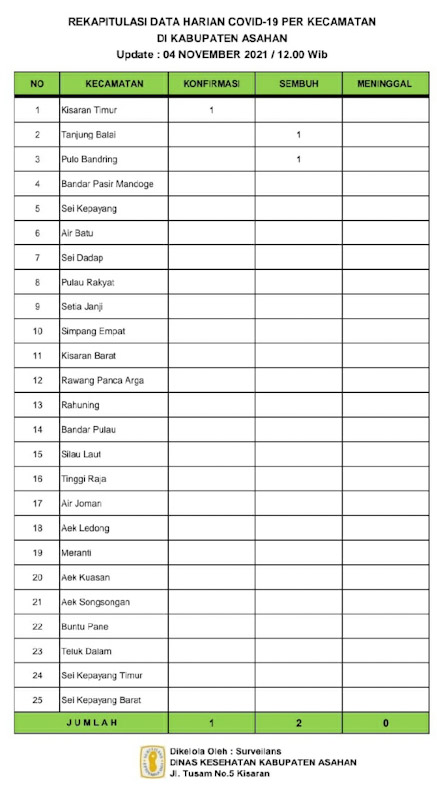 EKSISNEWS.COM, Asahan – Rekapitulasi Harian Covid – 19 per Kecamatan untuk hari ini sebagaimana data surveilans dari seluruh Puskesmas di wilayah Kabupaten Asahan yang di kelola Dinas Kesehatan Kabupaten Asahan pertanggal 04 Nopember 2021 hingga pukul 12.00 Wib, ada satu warga Asahan yang Terkonfirmasi Positif, ada dua yang sembuh dan tidak ada yang meninggal dunia.