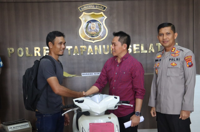 EKSISNEWS.COM, Tapanuli Selatan – Kurnia Pakpahan (37), korban pencurian dengan pemberatan (Curat), mengucapkan terima kasih ke Kapolres Tapanuli Selatan (Tapsel), AKBP Imam Zamroni, SIK, MH, Kasat Reskrim, AKP Rudy Saputra, SH, MH, serta jajaran, karena sepeda motornya yang sempat dicuri, kini sudah kembali lagi kepadanya.