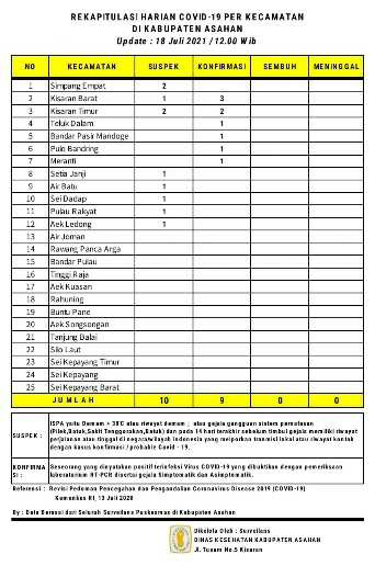 EKSISNEWS.COM, Kisaran – Rekapitulasi Harian Covid – 19 per Kecamatan untuk hari ini sebagaimana data surveilans dari seluruh Puskesmas yang ada di wilayah Kabupaten Asahan yang di kelola Dinas Kesehatan Kabupaten Asahan tanggal 18 Juli 2021 pukul 12.00 Wib ada 10 warga Asahan Suspek dan 9 orang Konfirmasi akibat Covid – 19.