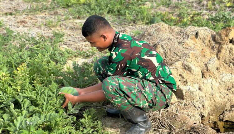 “Seperti yang terlihat di ladang milik Bapak Ahmad Iksan. Personel Satgas bahu-membahu melakukan perawatan tanaman semangka melalui penyiraman rutin. Kehadiran para prajurit di tengah perkebunan ini bukan sekadar bantuan tenaga, melainkan bentuk dukungan moral agar petani lokal semakin produktif dan berdaya.”