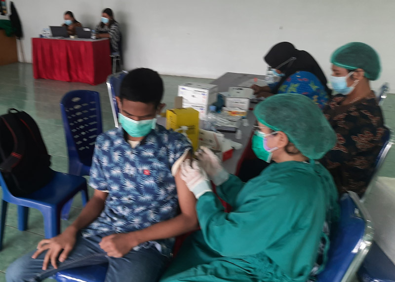 Pantauan Awak media vaksinasi tahap I covid 19 sangat antusias para siswa mengikuti untuk mendapatkan vaksin. Setiap peserta diswab terlebih dahulu, apabila hasilnya negatif petugas baru berani memberikan vaksin covid-19. (ENC Akmd).
