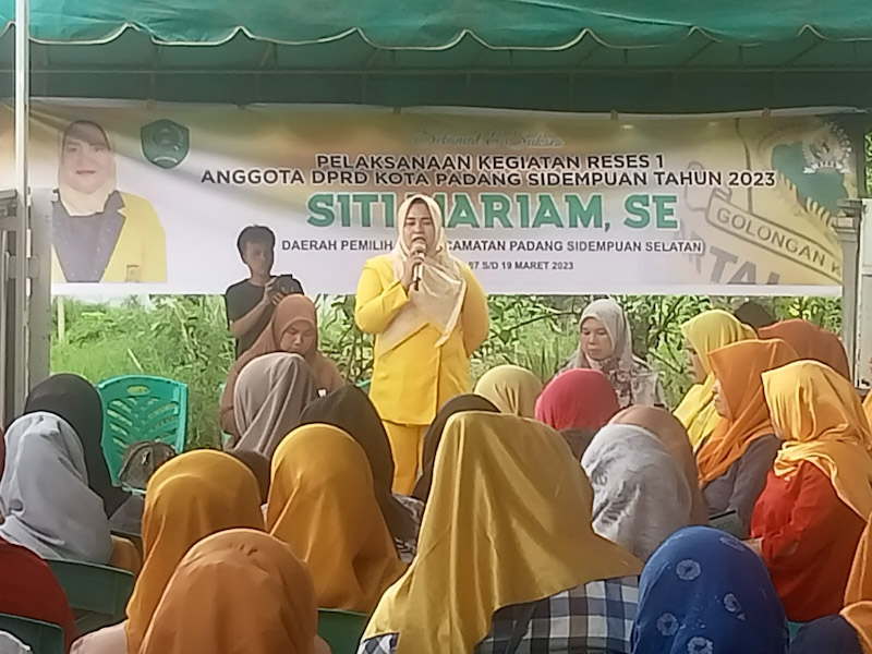 EKSISNEWS.COM, Padang Sidempuan – Anggota DPRD Kota Padang Sidempuan Siti Mariam SE ,Politis Partai Golongan Karya Dapil Kecamatan Padang Sidempuan Selatan,Kota Padang Sidempuan melaksanakan Reses Masa Sidang I Tahun 2023 bertempat di Kelurahan Aek Tampang,Kecamatan Padang Sidempuan Selatan,Kota Padang Sidempuan, Kamis (09/03/2023).