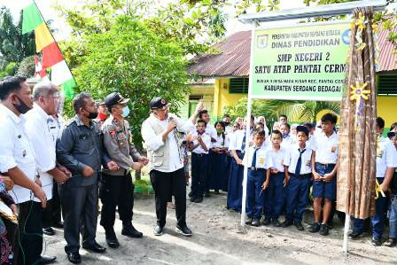 Bupati merinci, hingga sampai saat ini SD Negeri di Kabupaten Sergai ada 470, sementara SMP berjumlah 70, sudah termasuk swasta. Kita bayangkan siswa yang tamat SD ada 400 kelas, sementara SMP yang tersedia hanya 70 yang tentunya tidak akan mencukupi dan pastilah kekurangan menampung lulusan SD tersebut. Oleh karena itu meskipun dalam keadaan keterbatasan, maka kita terus berupaya menutupi kekurangan tersebut, karena selayaknya jumlah SMP juga berjumlah sama dengan SD yang ada. Maka salah satu tujuan diresmikannya SMPN 2 Satu Atap Pantai Cermin adalah untuk menampung semua siswa yang ditamatkan oleh SD menuju jenjang SMP.