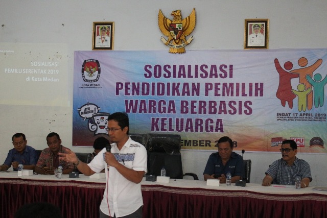 MEDAN, Eksisnews.com – Komisi Pemilihan Umum (KPU) Kota Medan gencarkan sosialisasi Pemilu Serentak, 17 April 2019. Dengan mengangkat tema Sosialisasi Pemilih Warga Berbasis Keluarga, banyak masukan dan ide yang diberikan dari warga kepada penyelenggara pemilu untuk menaikkan angka partisipasi pemilih saat acara digelar di Kantor Kecamatan Medan Kota, Jalan Stadion, Jumat (7/12/2018).