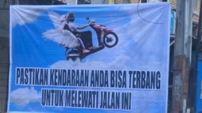 Pasalnya, spanduk dengan gambar kendaraan bersayap yang seolah-olah dapat terbang bertuliskan ‘Pastikan Kendaraan Anda Bisa Terbang untuk Melewati Jalan Ini’.