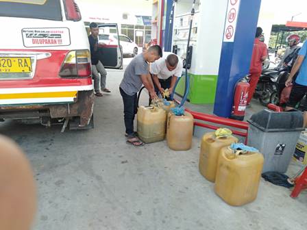 Setelah itu, satu per satu jerigen yang sudah di isi minyak berukuran 20 – 50 liter tersebut, oleh sipembeli memasukkannya ke dalam kenderaan jenis  mobil Cerry warna hitam.