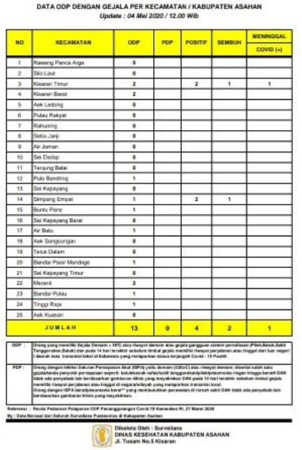 Dirinya juga mengatakan dimana Data Update tersebut berdasarkan hasil data surveilans dari seluruh Puskesmas yang ada di wilayah Kabupaten Asahan, yang di kelola Dinas Kesehatan Kabupaten Asahan pertanggal 04 Mei 2020 hingga pukul 12.00 Wib.
