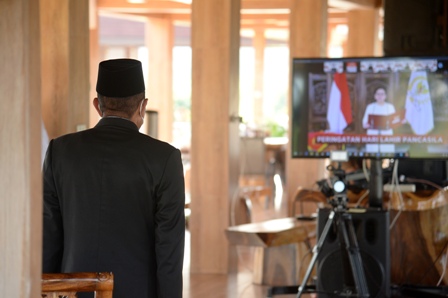 Gubernur Edy Rahmayadi didampingi Sekdaprov Sumut R Sabrina dan sejumlah pimpinan OPD Pemprov Sumut mengikuti upacara melalui video conference dari Kediaman Gubernur di Delitua, Kabupaten Deliserdang.
