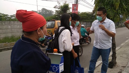 “Saya didampingi relawan eks pedagang Pasar Aksara disini. Pelibatan warga pedagang dalam aksi pembagian masker ditujukan agar mereka peduli terhadap sesama. Sama-sama menyadarkan masyarakat agar melindungi diri dari bahaya pencemaran oleh asap. Tak hanya disini, kita juga merencanakan pembagian masker secara cuma-cuma serupa di wilayah lainnya kepada warga.