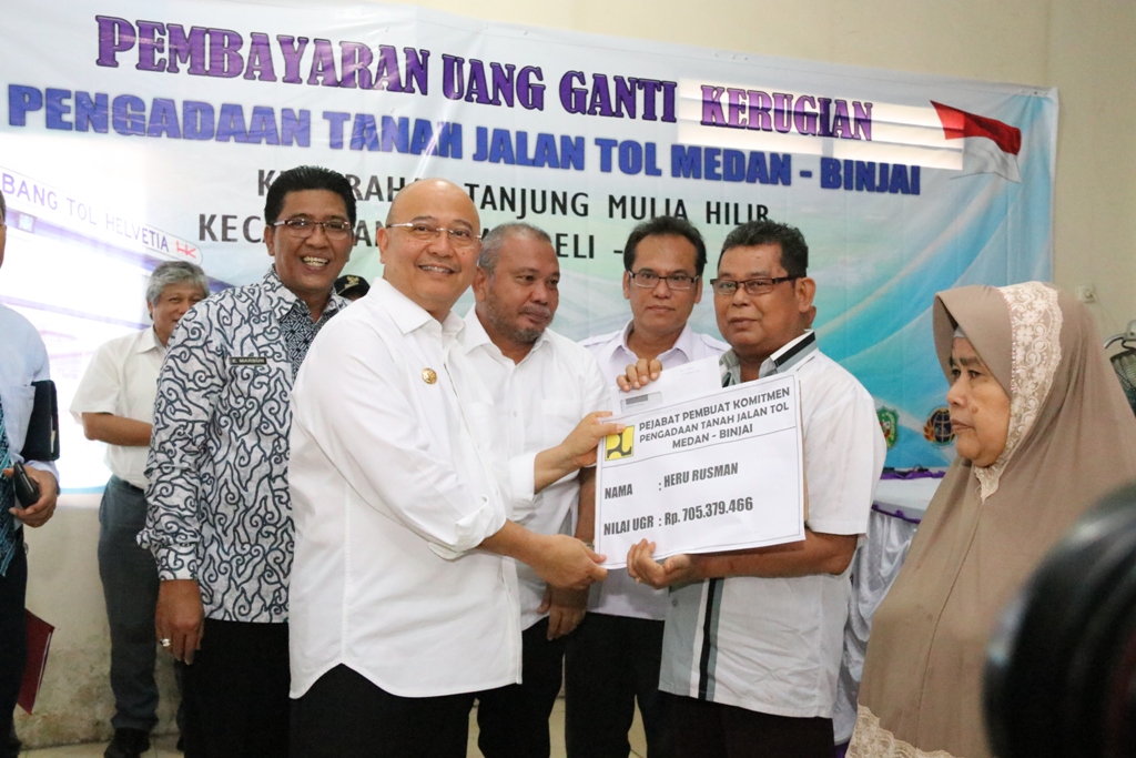 MEDAN, Eksisnews.com – Sebanyak 52 Kepala Keluarga (KK)  di Kelurahan Tanjung Mulia Hilir, Kecamatan Medan Deli tampak gembira setelah  pembayaran ganti rugi atas lahan yang terkena pembangunan Jalan Tol Medan Binjai direalisasikan di Aula Kantor Lurah Tanjung Mulia Hilir, Kamis (20/3) pagi. Pembayaran ganti rugi ditandai dengan penyerahan secara simbolis kepada lima orang warga oleh Wali Kota Medan Drs H T Dzulmi Eldin S MSi MH