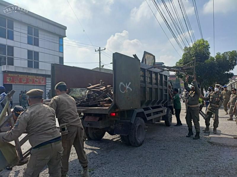 Para petugas mengangkut lapak daganan para PKL yang dianggap menggangu lalulintas di pinggir Jalan Selamat Ketaren tersebut.