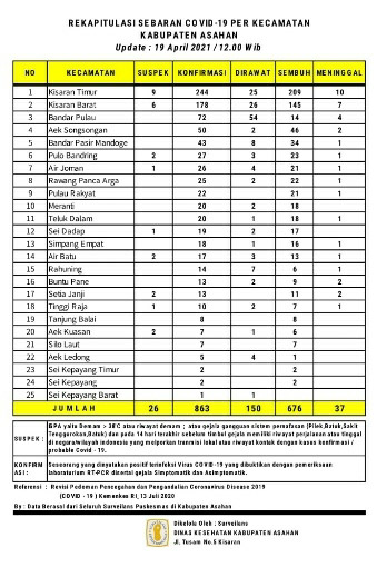 Demikian Data Update tersebut  disampaikan Juru Bicara Satuan Tugas Percepatan Penanganan Covid – 19 Kabupaten Asahan H. Rahmat Hidayat Siregar S. Sos. M.Si, Senin (19/04/2021) berdasarkan hasil data surveilans dari seluruh Puskesmas yang ada di wilayah Kabupaten Asahan sebagaimana di kelola Dinas Kesehatan Kabupaten Asahan pertanggal 19 April 2021 hingga pukul 12.00 Wib.
