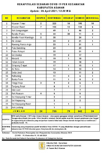 Dari 755 warga Asahan yang Konfirmasi ada sebanyak 79 orang dalam perawatan, 642 orang telah dinyatakan sembuh serta 34 orang meninggal dunia dan ada 24 orang yang dinyatakan Suspek.
