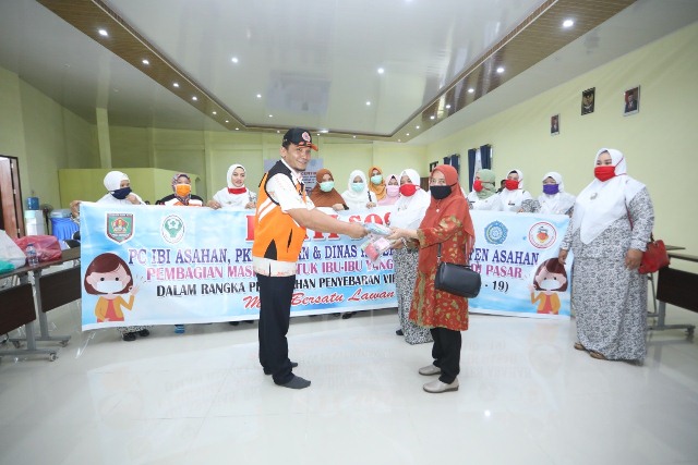 EKSISNEWS.COM, Kisaran – Dalam rangka pencegahan penyebaran Covid-19 di Kabupaten Asahan, TP PKK Kabupaten Asahan bekerjasama dengan Ikatan Bidan Indonesia dan Dinas Kesehatan Kabupaten Asahan membagikan 1000 masker kepada ibu-ibu yang melakukan aktivitas diluar rumah.
