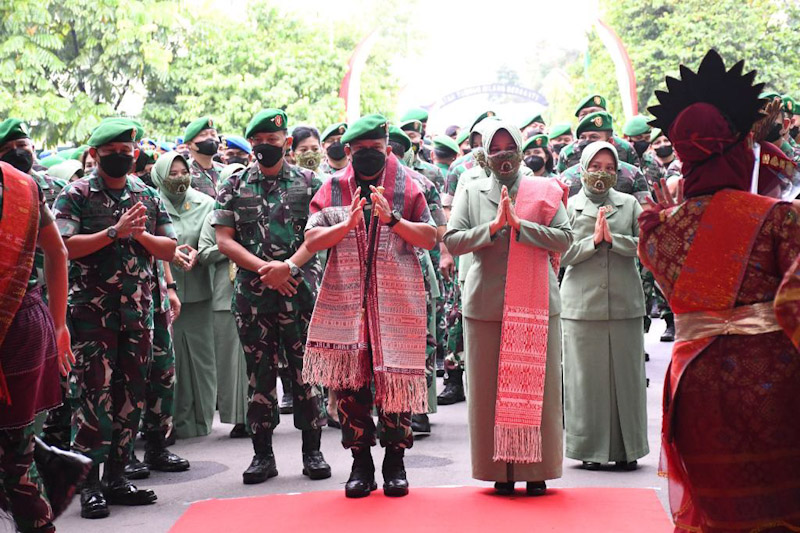 EKSISNEWS.COM, Medan – Tradisi “Boras Sipir Ni Tondi” yang mengandung makna filosifi penguat semangat menjadi salah satu momen spesial dalam rangkaian tradisi korps penyambutan Pangdam I Bukit Barisan, Mayjen TNI Achmad Daniel Chardin, SE, MSi, bersama Ketua Persit KCK Daerah I/BB, Ny Dra Intan Ainul Mardiah Daniel Chardin saat tiba di Markas Kodam I/BB, Jl Gatot Subroto Km 7,5 Medan, Selasa (8/3/2022) pagi.