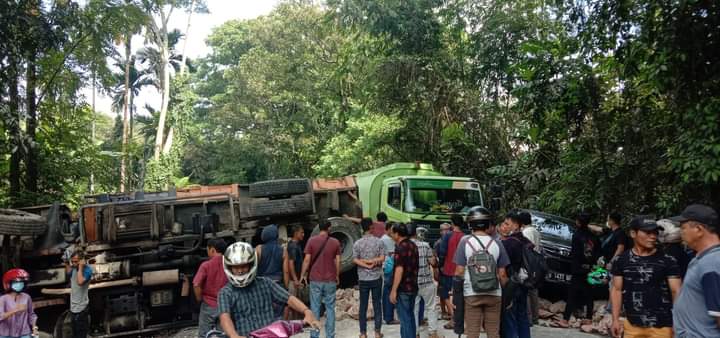 EKSISNEWS.COM, Deli Serdang – Sebuah truk muatan batu bongkahan terbalik ke badan jalan di jalur Medan-Berastagi, Desa Rambung Baru, Kecamatan Sibolangit, Kabupaten Deli Serdang, Sabtu (5/2/2022).