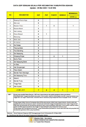 Dirinya juga mengatakan dimana Data Update tersebut berdasarkan hasil data surveilans dari seluruh Puskesmas yang ada di wilayah Kabupaten Asahan, yang di kelola Dinas Kesehatan Kabupaten Asahan pertanggal 09 Mei 2020 hingga pukul 12.00 Wib.