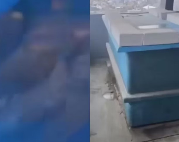 Dua jenazah tersebut tampak berada di bak air bewarna biru yang terletak di lantai atas gedung.