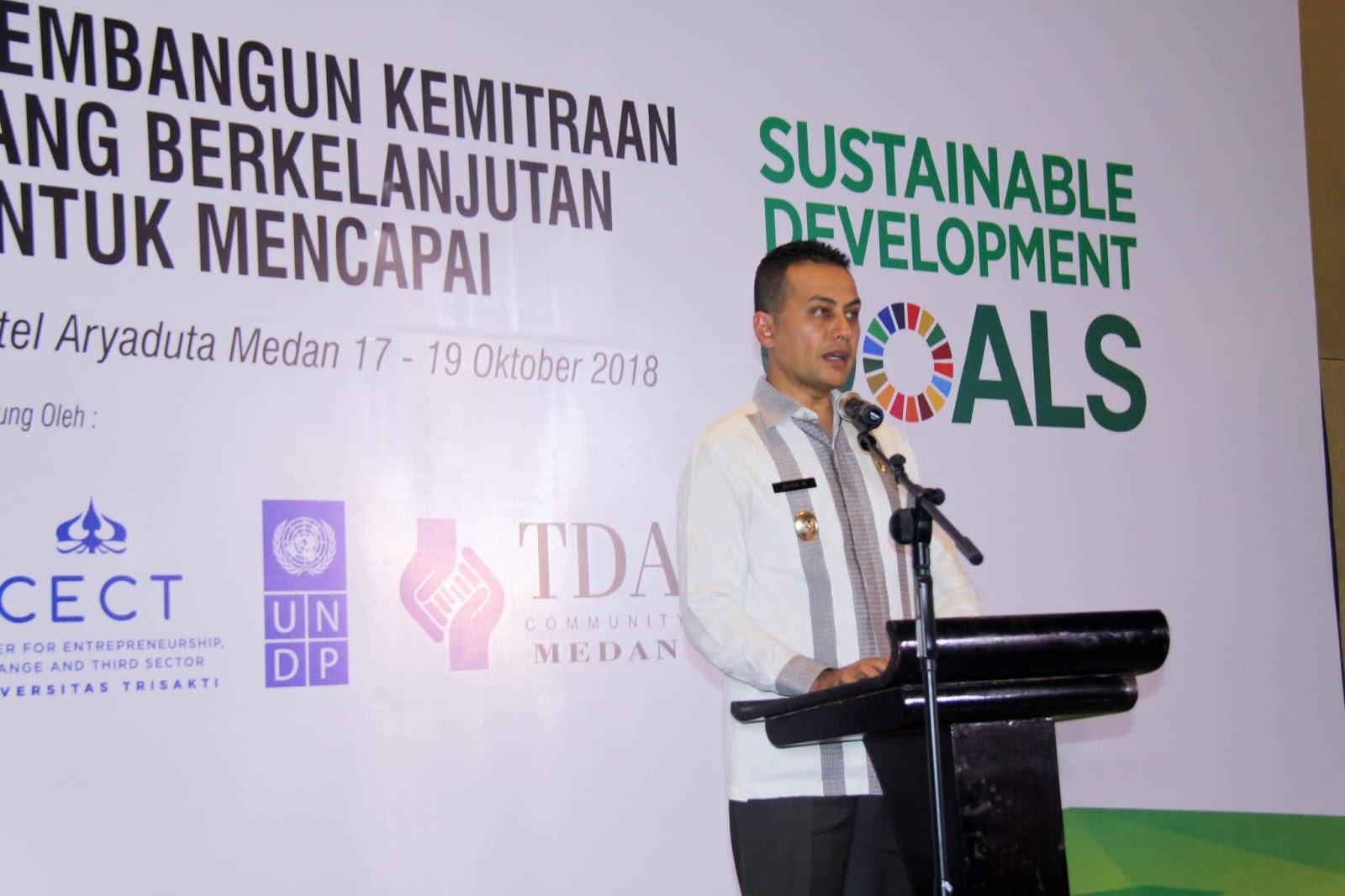 “SDGs atau yang juga dikenal dengan pembangunan berkelanjutan sudah terkandung dan diatur oleh Pemerintah Indonesia dalam rencana pembangunan, dikordinir oleh Bappenas dan didelegasikan pada tiap-tiap Bappeda. Tapi isu-isu ini belum familiar di tengah masyarakat, di sini lah peran penting media sangat diharapkan,” ujar Wagub Musa Rajekshah yang juga akrab disapa Ijeck pada Press Conference Seminar dan Workshop Nasional Membangun Kemitraan yang Berkelanjutan untuk Mencapai Sustainable Development Goals, di Hotel Aryaduta Medan, Rabu (17/10).