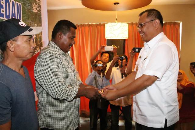 MEDAN, Eksisnews.com – Wakil Wali Kota Medan Ir H Akhyar Nasution MSi didampingi Direktur SDM dan Umum Pelindo I M Hamied Wijaya dan  Dirut PT Prima Terminal Peti Kemas Jansen Sitohang memberikan tali asih kepada sejumlah nelayan di Hotel Emerald Garden, Rabu (10/4). Tali asih ini diberikan sebagai bentuk ganti rugi kepada nelayan yang terdampak reklamasi pembangunan terminal peti kemas di Pelabuhan Belawan.